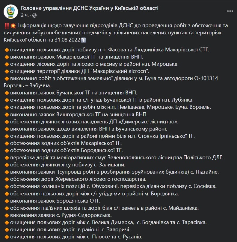В среду, 31 августа, в Киевской области снова будут слышны взрывы. Там происходит разминирование.