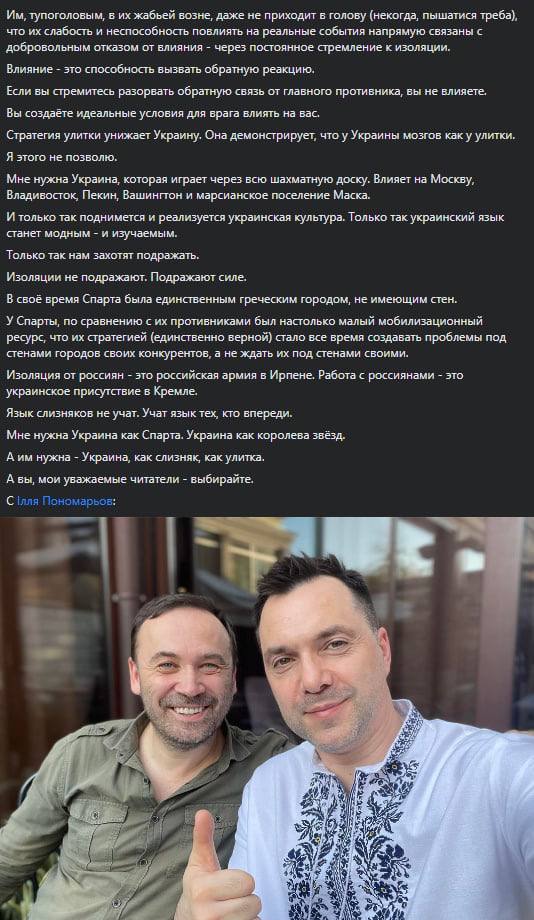 "Они говорят: не нужно нам тут оппозиции Путину, валите в РФ, а мы тут закроемся, на Родинке, будем любить друг друга и пишатися. Политический центр боевой оппозиции Путину в Украине - это влияние. Наше влияние на РФ. Только д@лбо@б может добровольно отказываться от влияния", - пишет Арестович.