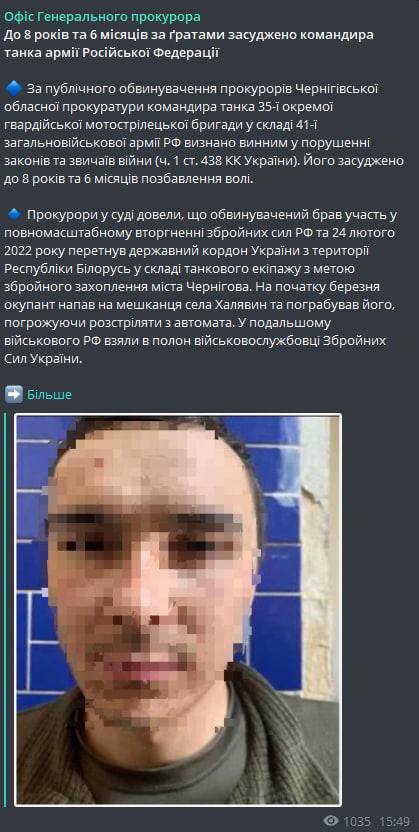 Командира российского танка, участвовавшего в российском вторжении в Украину, приговорили к 8 годам и 6 месяцам лишения свободы. Его обвинили в нарушении обычаев войны.