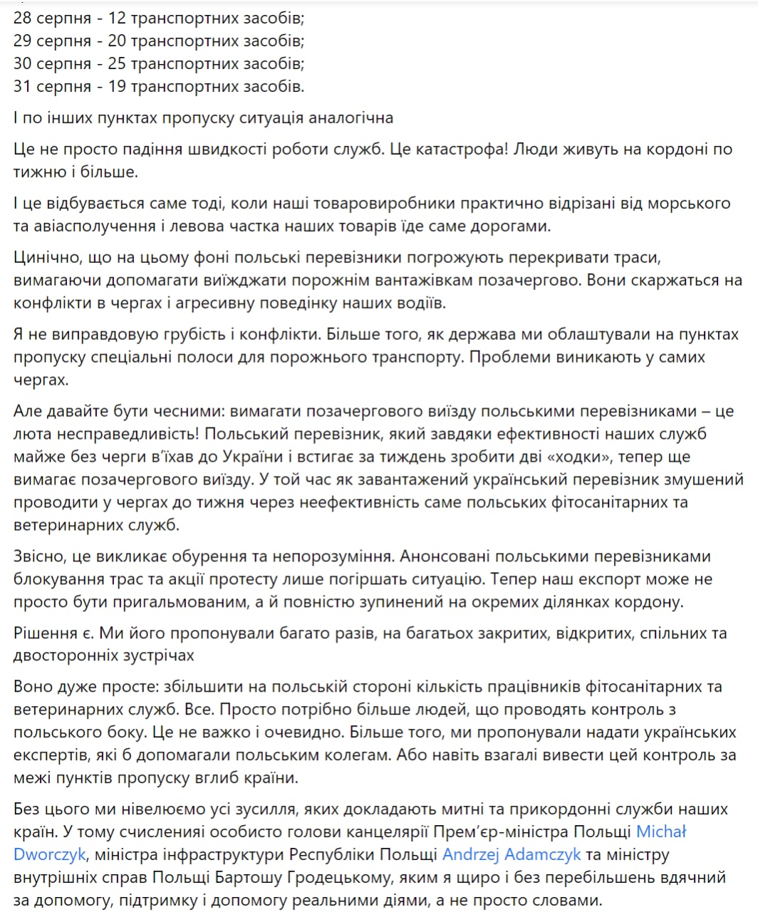 "Более того, мы предлагали предоставить украинских экспертов, которые помогали бы польским коллегам. Или вообще вывести этот контроль за пределы пунктов пропуска вглубь страны", - написал Найем.