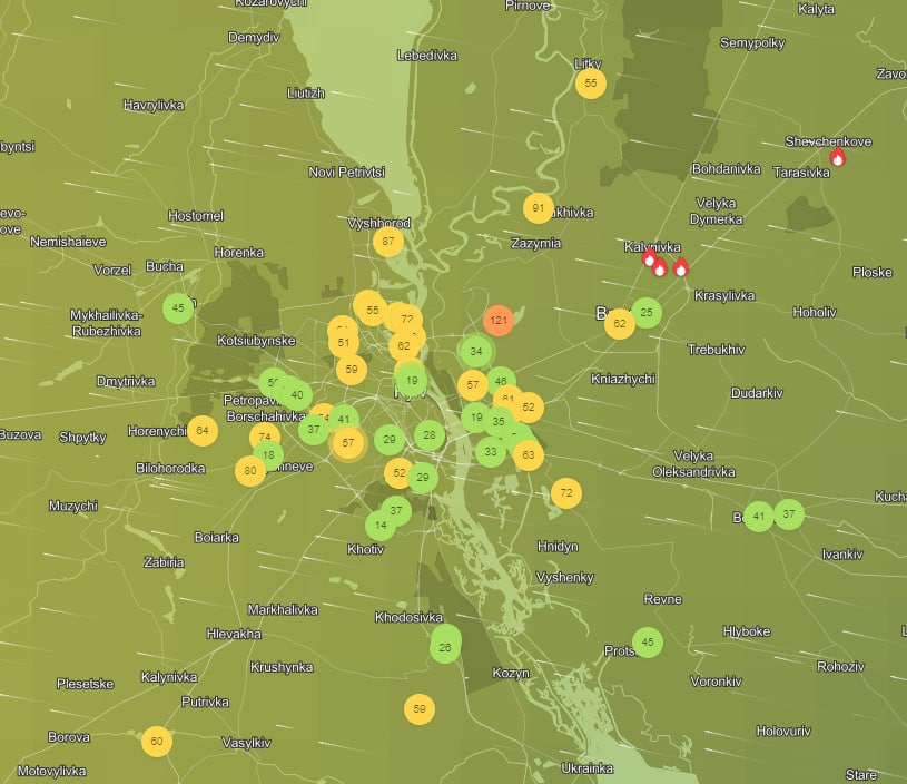 Согласно сервису IQ-Air наиболее высокие показатели загрязнения - на Троещине и в Вышгороде. То есть в районах, наиболее близких к зонам пожаров.
