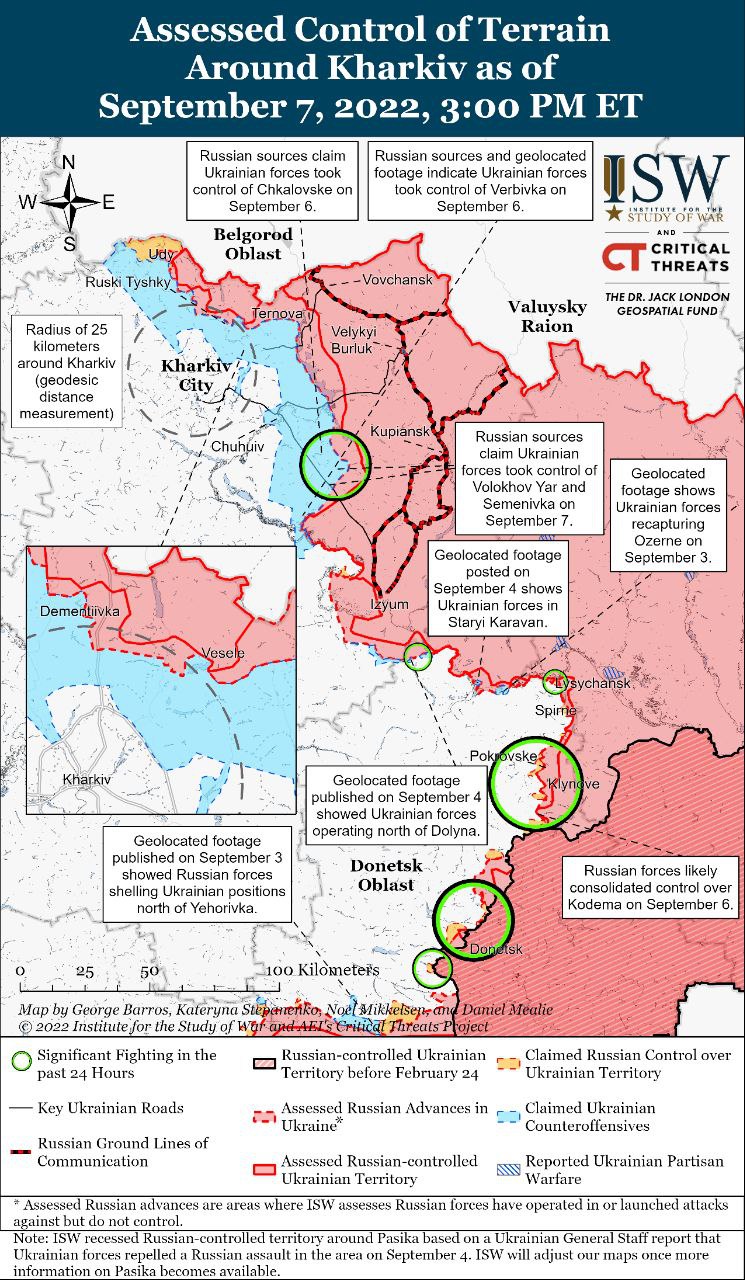 В четверг, 8 сентября, "Институт изучения войны" (США) пишет, что украинские войска под Балаклеей продвинулись на 20 километров вглубь российских позиций и контролируют 400 квадратных километров территории.