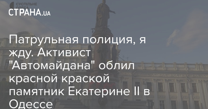 Фото с облитым монументом опубликовал сам активист, подписав его "патрульная полиция Одесской области, я жду". Вскоре Григоряна отвезли в отделение полиции, но протокол на него составлять не стали.