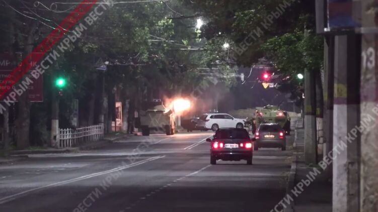 Российские СМИ показали кадры пулеметной стрельбы в Херсоне, которую ведет российская техника в районе железнодорожного вокзала.