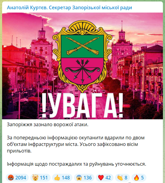 В горсовете Запорожья уточнили, что удар наносился по двум объектам инфраструктуры.