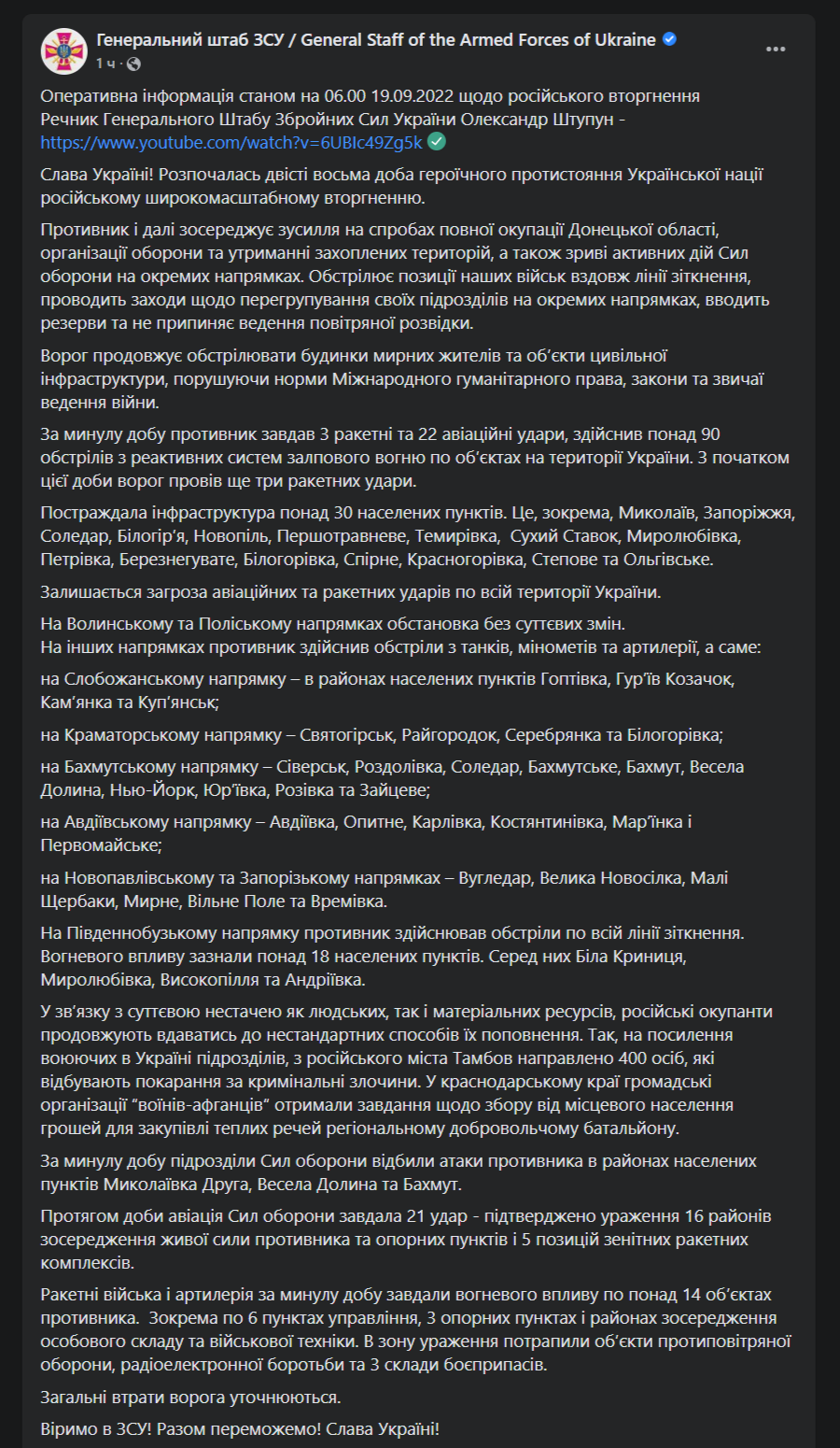 Утром в понедельник, 19 сентября, Генштаб ВСУ опубликовал актуальную сводку с фронта. Сообщается, что ВСУ отбили атаки противника в районах Бахмута и населенных пунктов к югу от него - Веселой Долины и Николаевки 2-й.
