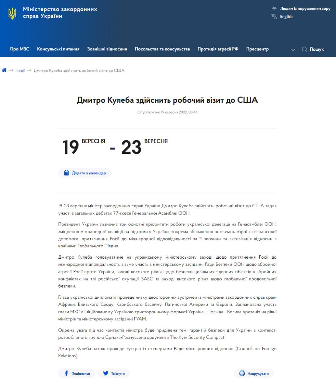 Также сообщается, что Кулеба проведёт ряд двухсторонних встреч с министрами иностранных дел стран Африки, Ближнего Востока, Карибского бассейна, Латинской Америки и Европы.