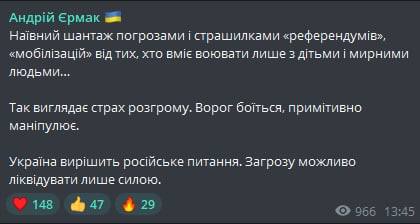 "Фиктивные референдумы не имеют легитимности и не изменяют характера агрессивной войны РФ против Украины", – заявил он.