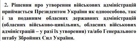 При этом военные администрации будут временно исполнять полномочия соответствующих сельских, поселковых, городских, районных советов в случае принятия решения Верховной Радой по обращению президента. Важная ремарка создание такой военной администрации Верховной Радой сможет произойти в случае "принятия (соответствующими местными органами власти) решений с нарушением Конституции или законов Украины". Руководителей военной администрации в регионе президент будет назначать (и увольнять) по предложению соответствующей ОГА.