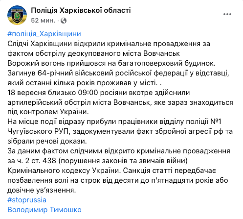 В результате вчерашнего обстрела Волчанска Харьковской области погиб 64-летний российский военный в отставке, который последние несколько лет проживал в украинском городе.