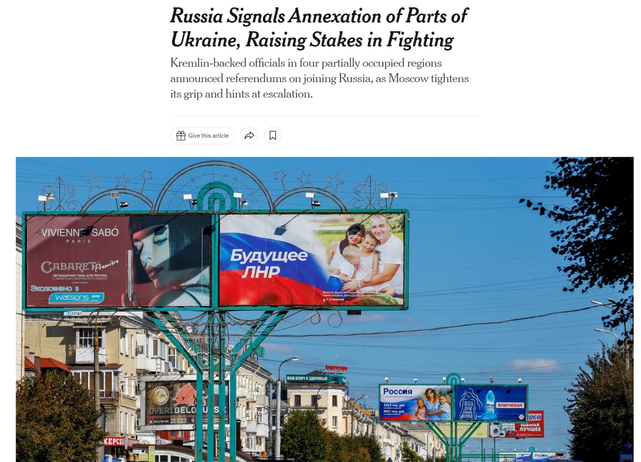 08:19 Газета The New York Times выделяет три объяснения, почему Россия решила провести "референдумы" на захваченных ей территориях.