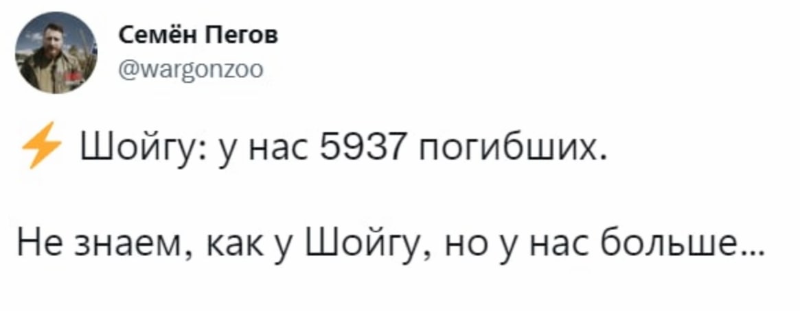 10:02 Российский военкор Семен Пегов отреагировал на заявление Шойгу о том, что РФ потеряла за 7 месяцев войны 6 тысяч человек.