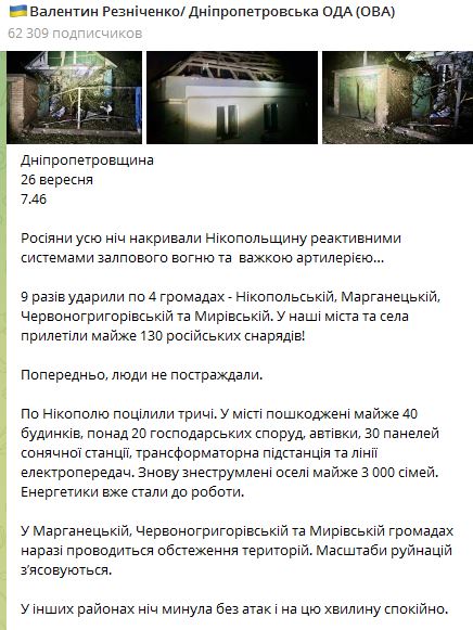 07.50 Ночью в Днепропетровской области россияне из РСЗО и тяжелой артиллерии 9 раз ударили по 4 громадам – Никопольской, Марганецкой, Красногригоревской и Мировской. Всего прилетело около 130 российских снарядов!