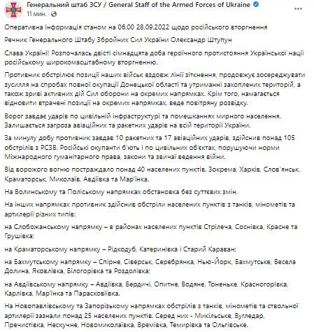 В среду, 28 сентября, Генштаб ВСУ опубликовал утреннюю сводку о ситуации на фронте.