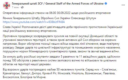 Генштаб ВСУ опубликовал сводку о ситуации на фронте на утро 30 сентября.