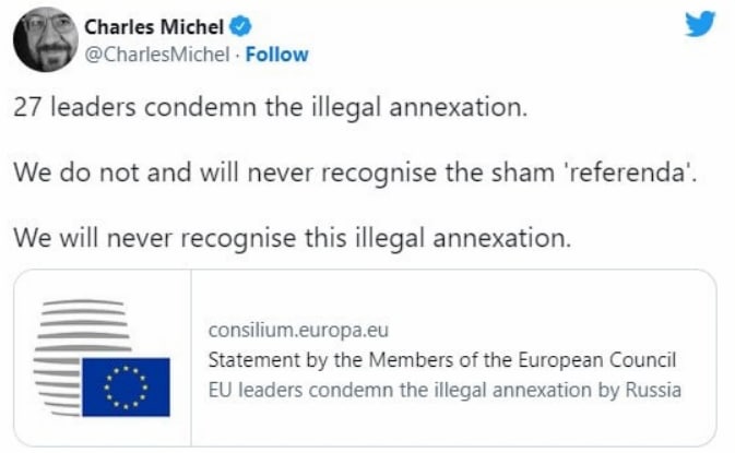 Председатель Совета Европы Шарль Мишель заявил о том, что лидеры стран-членов ЕС осуждают незаконную аннексию Россией территорий Украины.