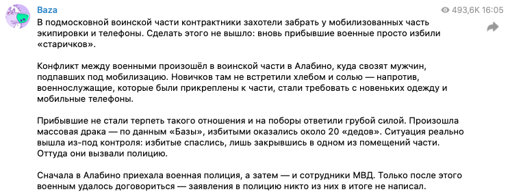 Конфликт якобы произошёл в воинской части в Алабино, куда свозят мужчин, подпавших под мобилизацию.