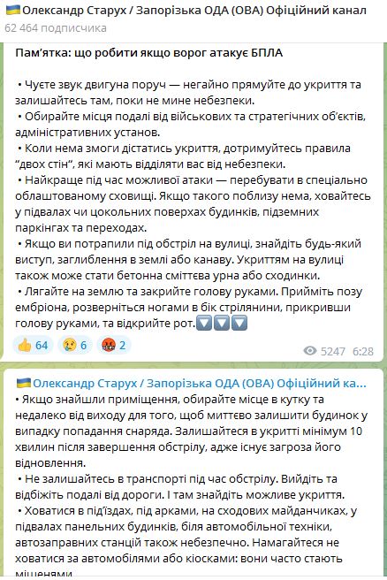 Правила безопасности в телеграм-канале напомнил глава Запорожской ОВА Александр Старух.