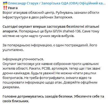 В пятницу, 7 октября, Запорожье впервые атаковали дронами Shahed-136.