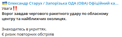 "Враг нанес очередной ракетный удар по областному центру и ближайшим окрестностям. Находитесь в укрытиях. Есть риск повторных обстрелов", - написал он.
