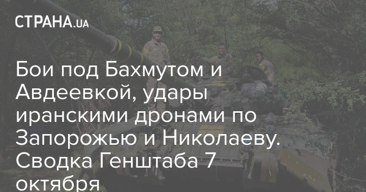 В Генеральном штабе Вооруженных сил Украины опубликовали оперативную сводку с фронта по состоянию на 18:00 7 октября. Сообщается, что украинская армия обороняется под Бахмутом и Авдеевкой, а российские войска применяют иранские дроны для ударов по Запорожью и Николаеву.