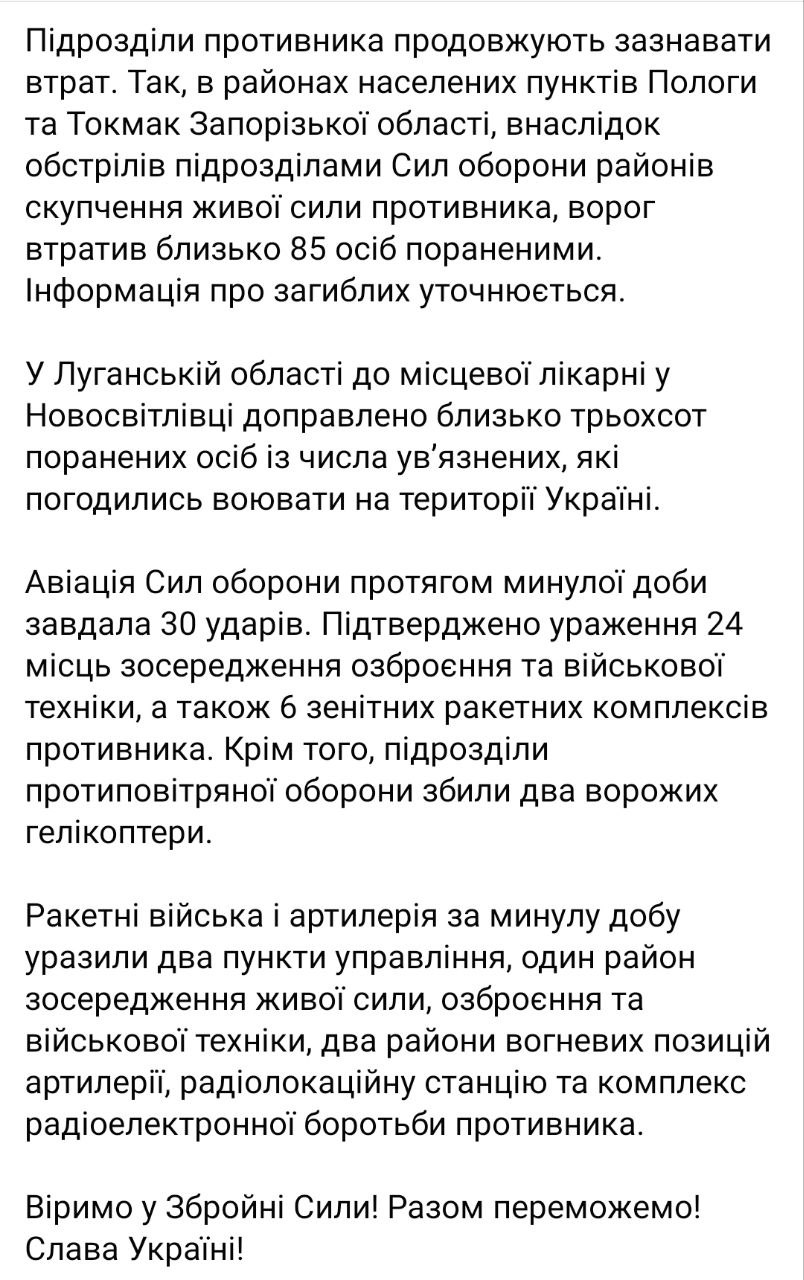О наступательных действиях ВСУ на юге и в Луганской области Генштаб не упоминает.