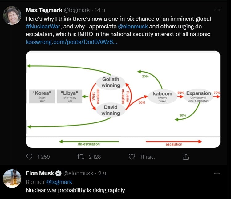 Маск в ответ на это написал: "Вероятность ядерной войны возрастает стремительно".