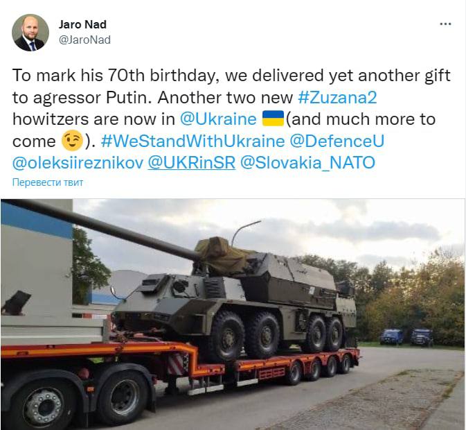 "Чтобы отметить его 70-летие, мы вручим еще один подарок агрессору Путину. Очередные две новые Zuzana-2 поступили в Украину (и многое другое) #МыВыстоимСУкраиной", - написал Надь в Твиттере.