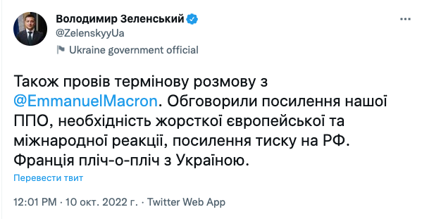 А с Макроном обсудили усиление украинской ПВО, "необходимость жесткой европейской и международной реакции, усиление давления на РФ".