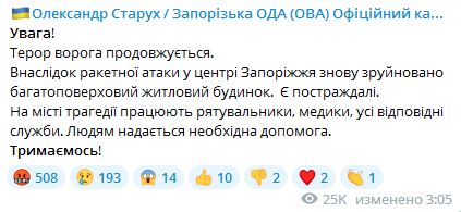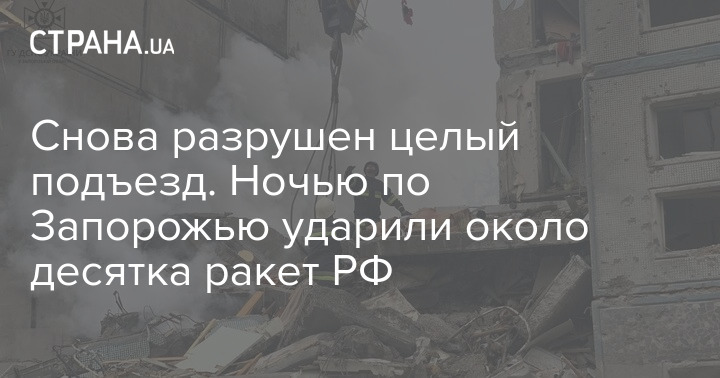 Секретарь Запорожского горсовета Анатолий Куртев сообщил, что ракетный удар вновь  уничтожил целый подъезд в жилом доме: "Рашисты снова ударили по жилищной инфраструктуре города. Снова разрушен целый подъезд. В доме возник пожар. На месте работают соответствующие службы".