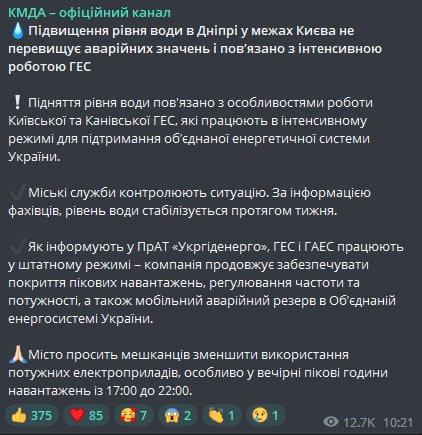 В КГГА сообщают, что повышение уровня воды не превышает аварийных значений и связано с интенсивной работой Киевской и Каневской ГЭС.