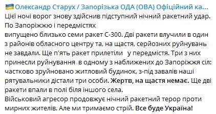 По его данным, по Запорожью и пригородам выпущено около семи ракет С-300. Две ракеты попали в один из районов областного центра и, к счастью, серьезных разрушений не нанесли.