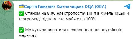 "По состоянию на 08.00 электроснабжение в Хмельницкой тергромаде возобновлено почти на 100%. Могут оставаться неисправности во внутренних сетях" - написал глава ОВА,