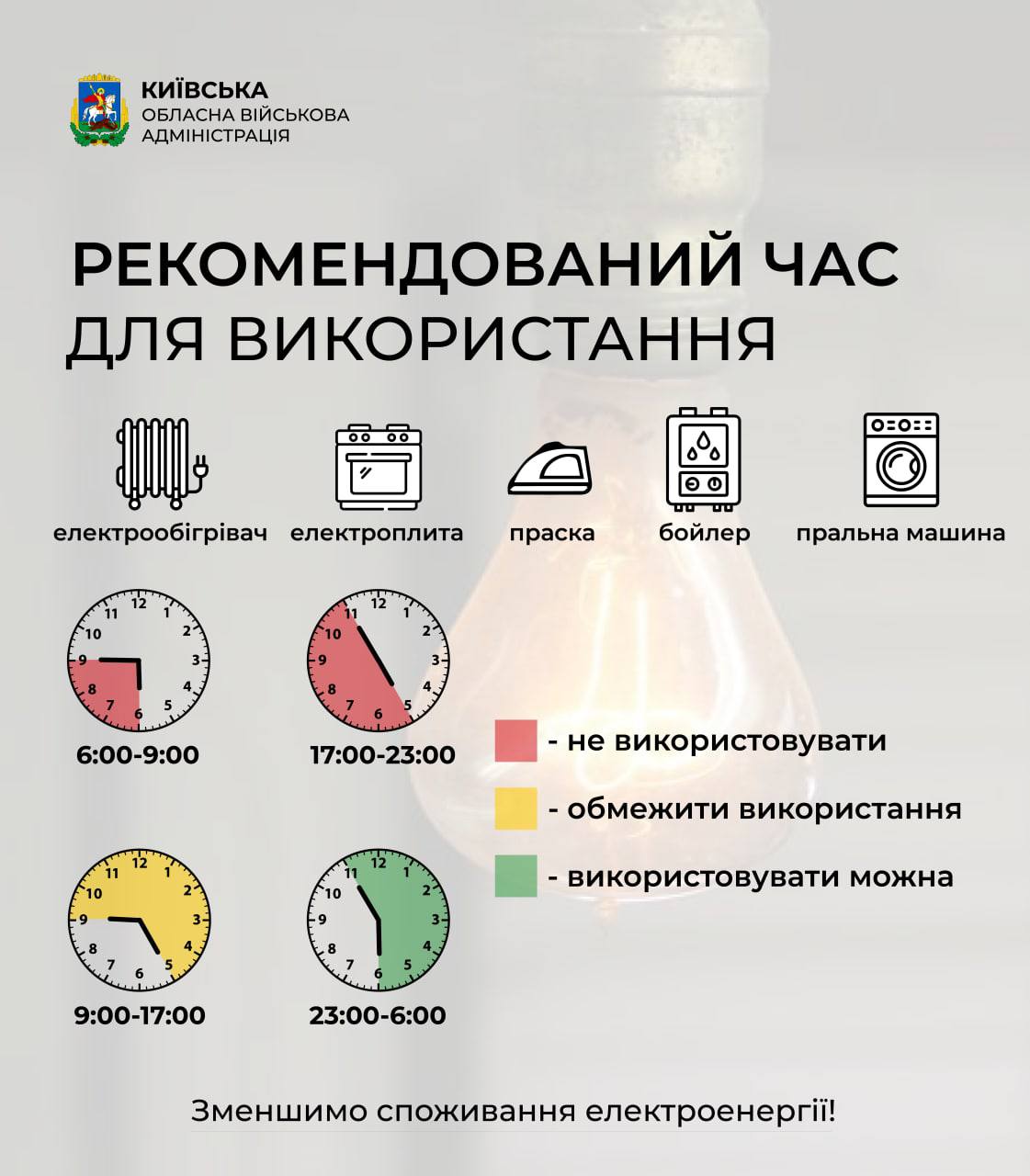 Глава Киевской ОВА Алексей Кулеба публикует инфографику, как пользоваться электроприборами (электрообогревателем, электроплитой, утюгом, бойлером, стиральной машиной), чтобы уменьшить потребление электроэнергии.