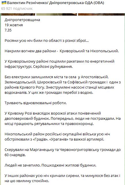 В Криворожском районе попали ракеты по энергетической инфраструктуре. Там серьезные разрушения.