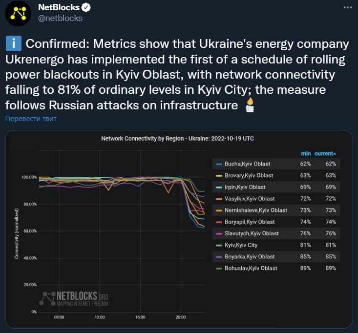 Так, подключение к сети упало до 81% от обычного уровня в Киеве, до 62-63% в Буче и Броварах, 69% - в Ирпене.