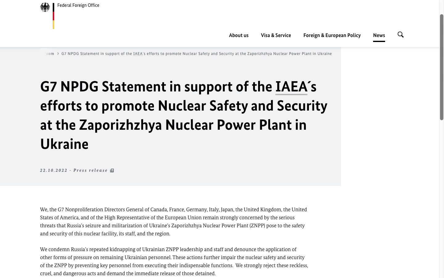 G7 призвала освободить всех похищенных сотрудников Запорожской АЭС и вернуть станцию Украине