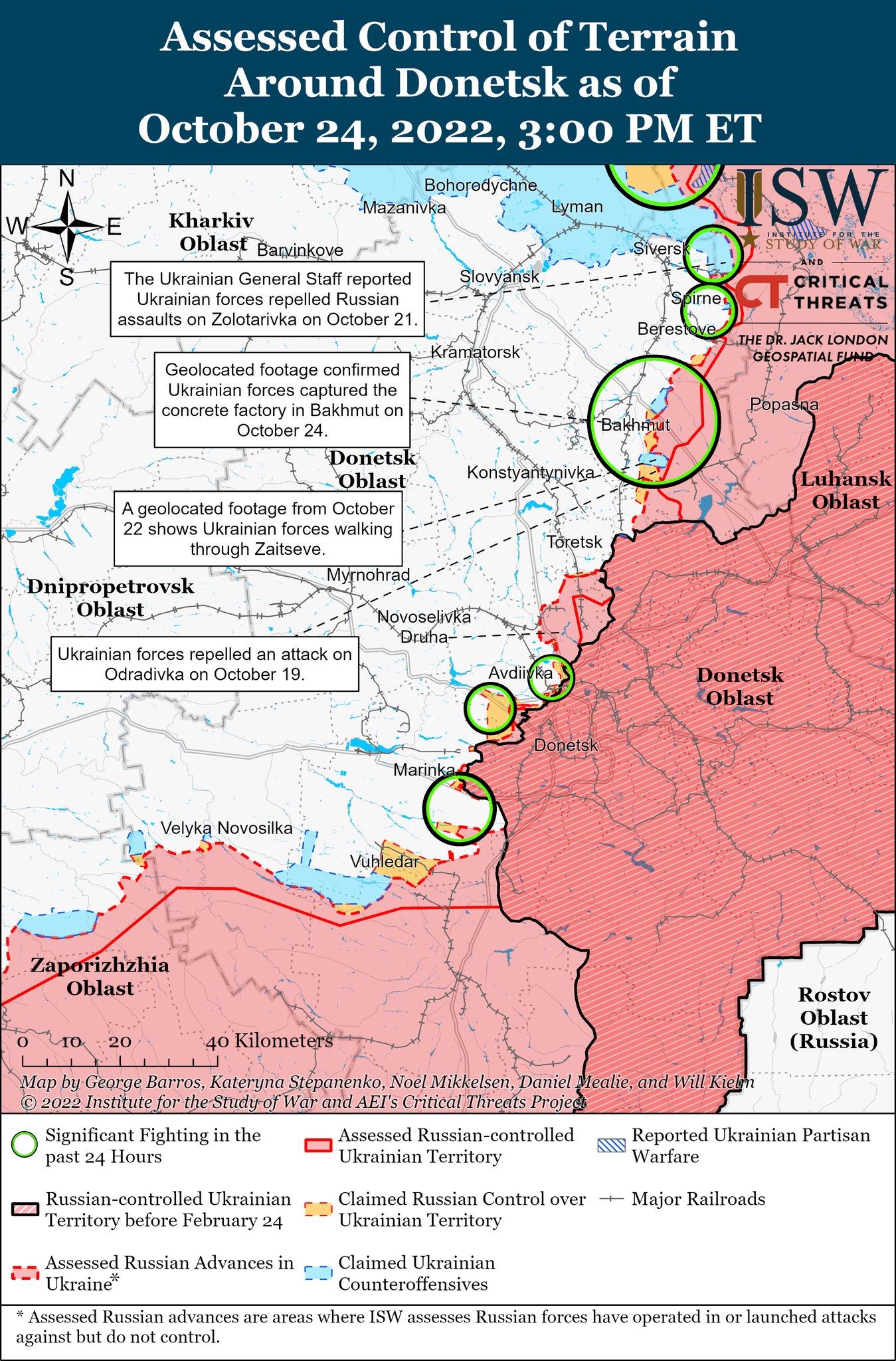 Американский Институт изучения войны 25 октября опубликовал актуальные карты боевых действий в Украине. Сообщается, что Генштаб Украины подтвердил, что ВСУ освободили Кармазиновку, Мясожаровку и Невское в Луганской области и Новосадово в Донецкой области.