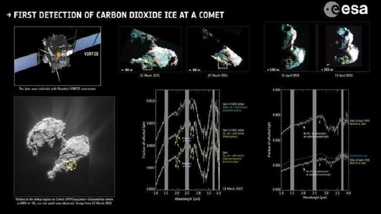 На комете Чурюмова-Герасименко есть пятна твердой углекислоты, до этого не встречавшиеся на поверхности небесных тел. Об этом сообщает "Life".