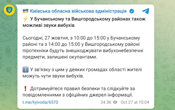 Жителей Киевской области предупредили о возможных звуках взрывов в области из-за работы пиротехников утром и днем в четверг, 27 октября. Специалисты будут работать в Бучанском и Вышгородском районах.