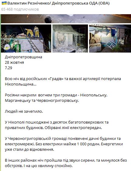 28 октября в Днепропетровской области Никопольский район всю ночь был под огнем российских "Градов" и тяжелой артиллерии.
