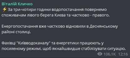 Об этом в 12.16 сообщил мэр столицы Виталий Кличко.