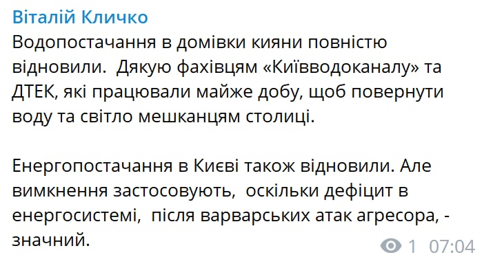 "Водоснабжение в домах киевлян полностью восстановили. Благодарю специалистов "Киевводоканала" и ДТЭК, которые работали почти сутки, чтобы вернуть воду и свет жителям столицы.