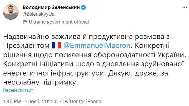 "Чрезвычайно важный и продуктивный разговор с президентом Франции. Конкретные решения по усилению обороноспособности Украины.
