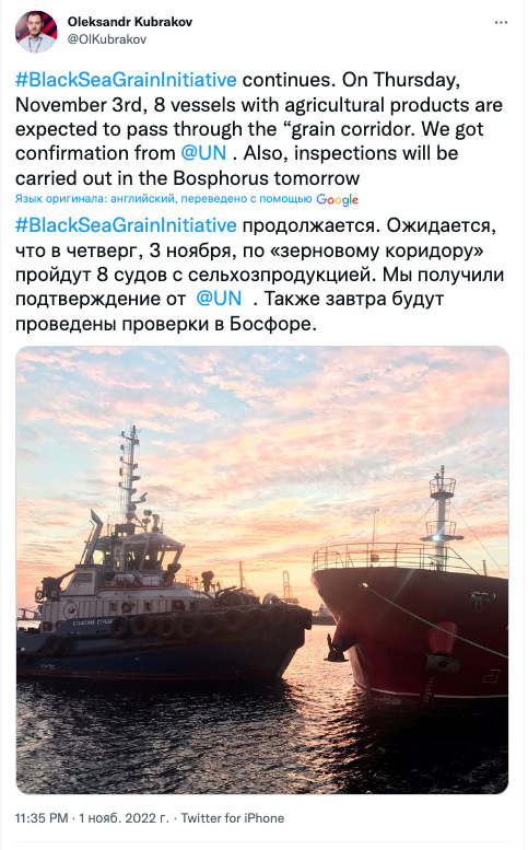 Ранее сообщалось, на сегодня, 2 ноября, Турция, Украина и ООН не запланировали движения кораблей по "зерновой сделке".