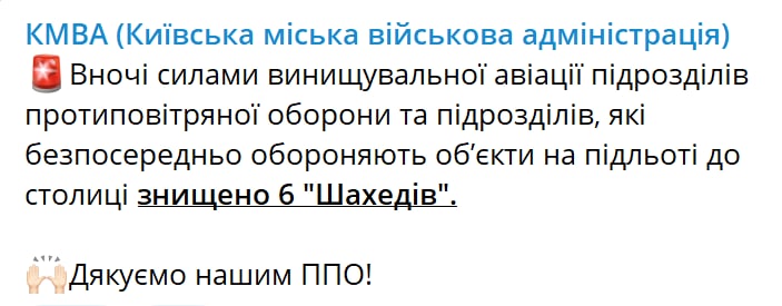 В частности, шесть беспилотников-камикадзе было сбито на подлете к Киеву.