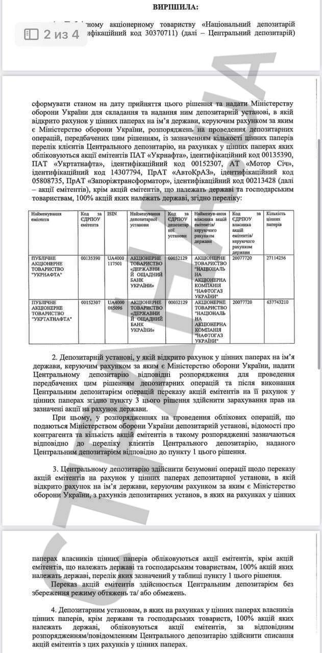 Речь идет о решении НКЦБФР по изъятию акций ОАО "Укрнефть", ОАО "Укртатнефть", АО "Мотор Сич", ЧАО "АвтоКрАЗ", ЧАО "Запорожтрансформатор".
