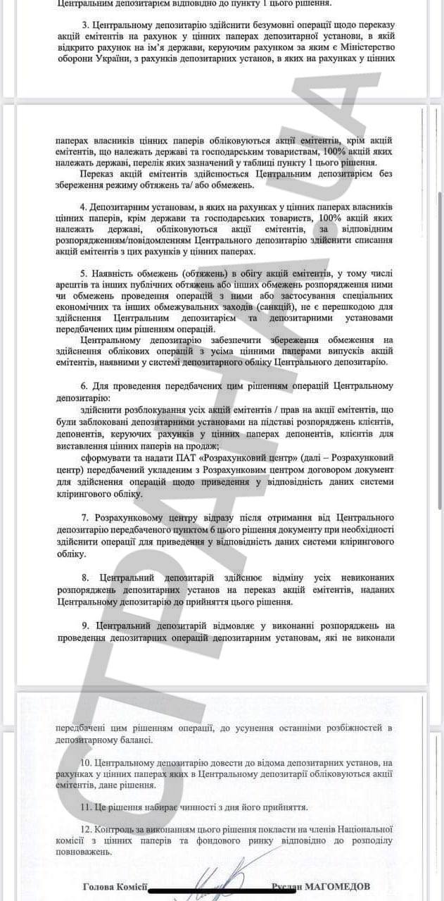 В документе указано, что акции переходят в собственность государства, на основании решения Ставки верховного главнокомандующего и ряда законов о режиме военного положения, в частности, принятый в сентябре закон "О передаче, принудительном отчуждении или изъятии имущества в условиях правового режима военного или чрезвычайного положения".