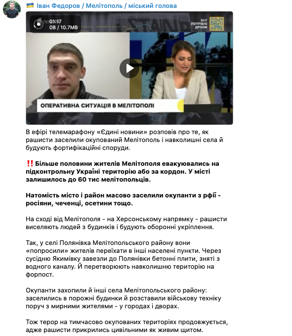 В оккупированном Мелитополе остается порядка 60 тыс. местных жителей (до войны в городе проживало порядка 150 тыс. человек). При этом город и район активно заселяют жителями РФ: русскими, чеченцами, осетинами и тд.