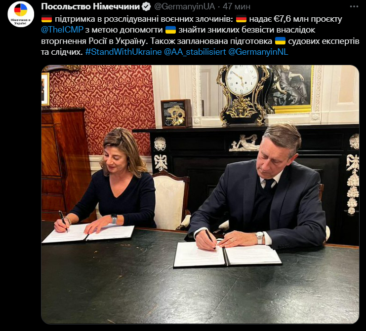 По данным посольства Германии, поддержка будет предоставлена в расследовании военных преступлений. В частности, 7,6 млн евро будут переданы проекту Международной комиссии по пропавшим без вести лицам (ICMP) с целью помочь Украине найти пропавших без вести в результате вторжения России в Украину.